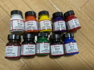 下の画像はアンジェラスペイントという靴にも革製品にも描けるインクです。