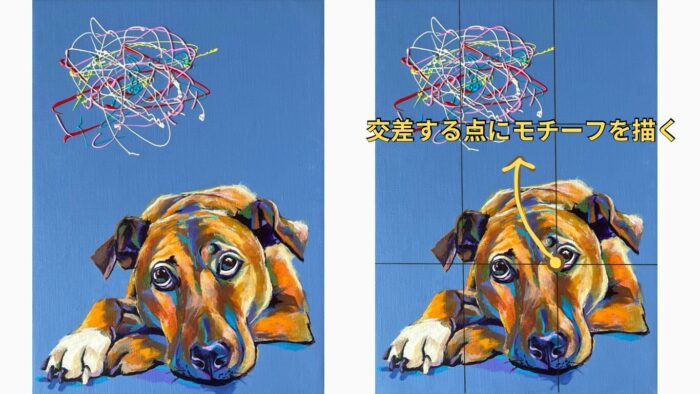 下の絵を見ていくと、3分割した交差する点にモチーフを描いています
