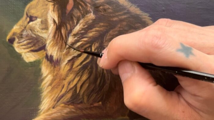 ①例えば短い毛並みを描く時は筆先に近い部分を持って筆がブレないようにします