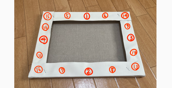 2、キャンバスを抑えながらガンタッカーで画像の順番に打っていきます
